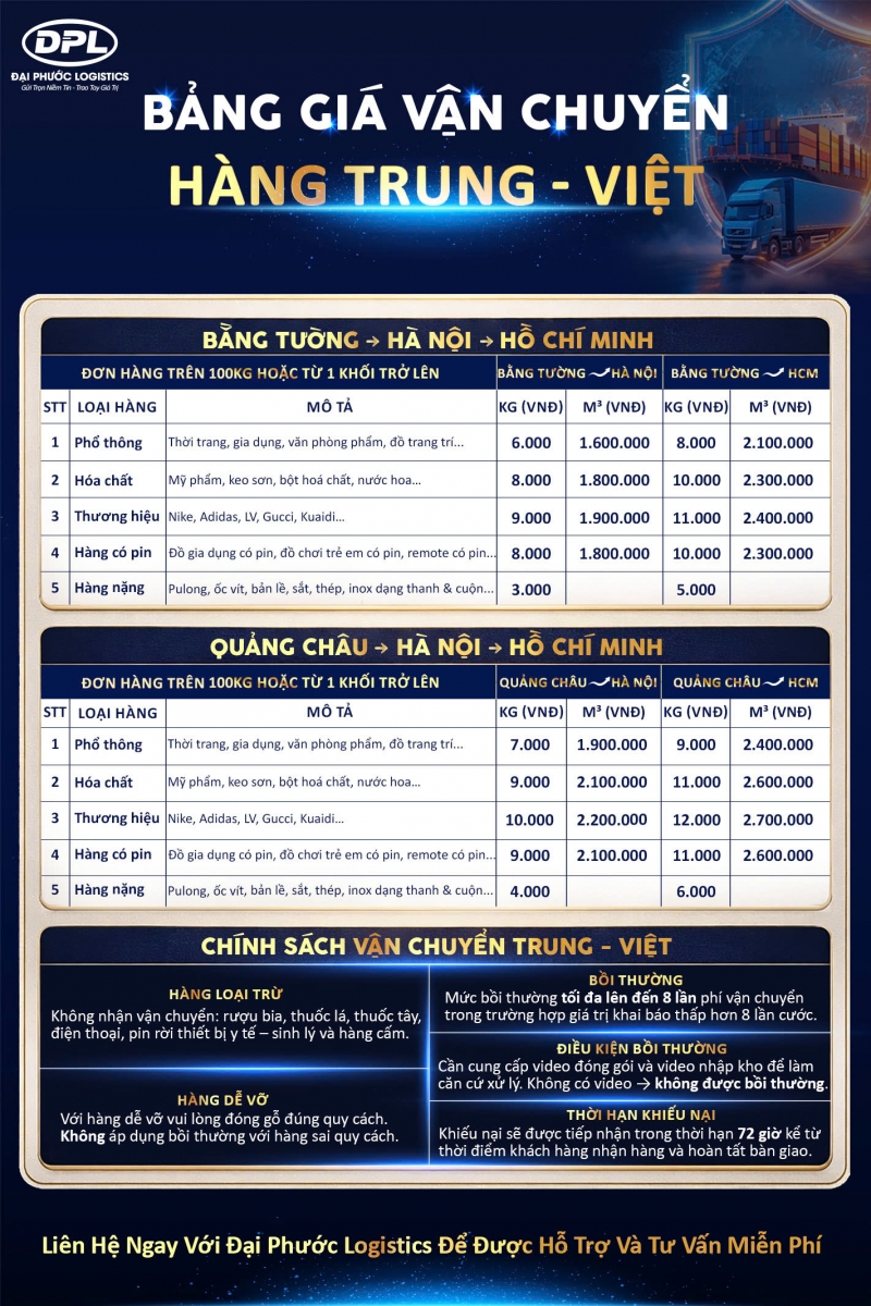 Bảng giá vận chuyển Trung - Việt